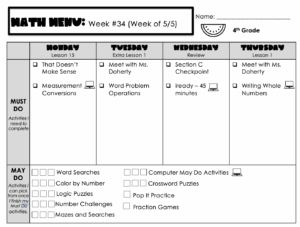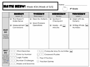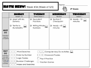 When they finish their Must Do activities for the day, they move on to their May Activities. These are done by the week. ST Math has three check boxes next to it. That means that this week, they can do ST math up to three times.